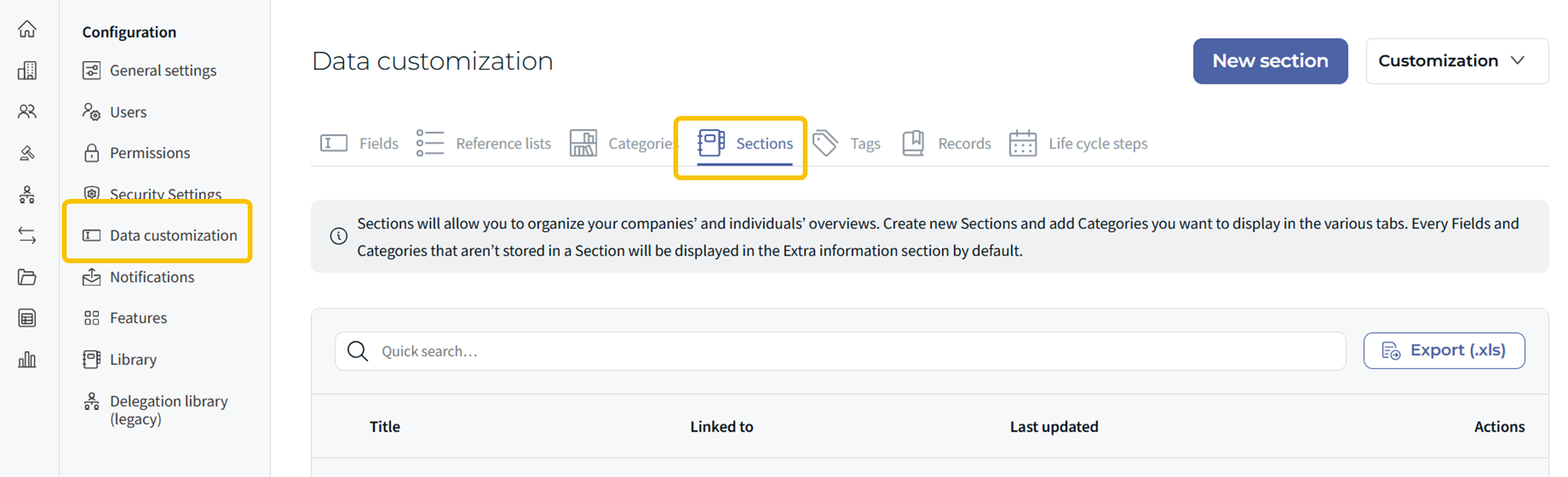 As an administrator, you can create sections from the 'Data customization' page to be added as a tab in the 'Overview' page based on the section's type (Company or Individual):
